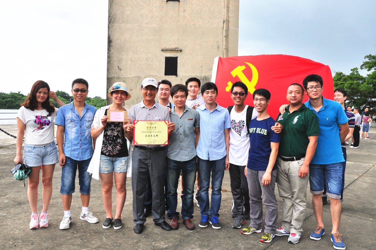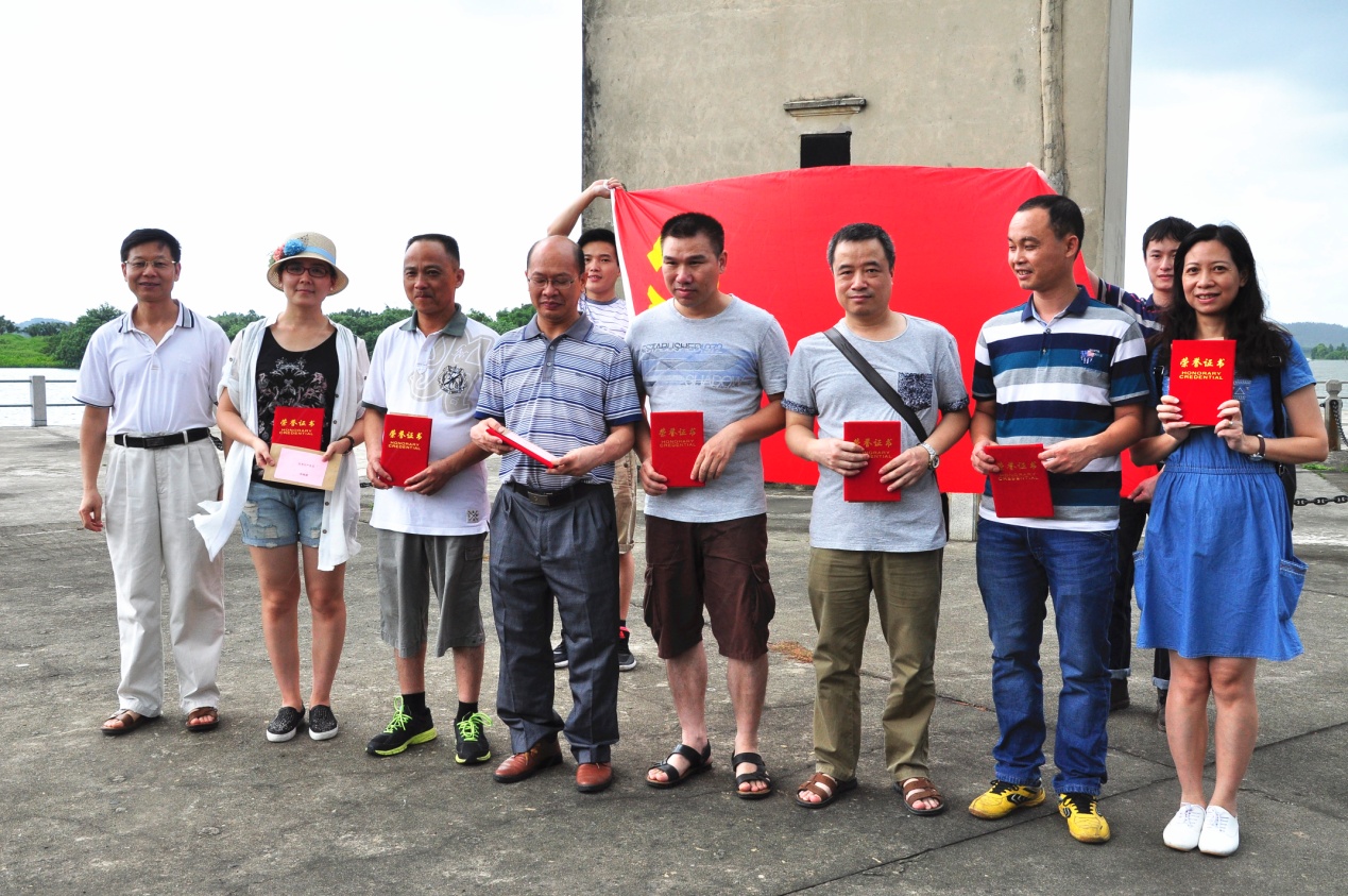 參觀當(dāng)天,艷陽高照,在歡聲笑語的旅游車上,建黨紀(jì)念活動(dòng)首先在熱烈的黨史知識(shí)有獎(jiǎng)問答競(jìng)賽拉開了帷幕。當(dāng)答題告罄,獎(jiǎng)品紛紛易主時(shí),汽車就抵達(dá)開平南樓。該樓建于1921年,樓高七層19米,每層均有機(jī)槍和探照燈,是司徒氏人為防盜賊而建。抗戰(zhàn)時(shí)期,七名歸僑及僑屬青年曾在此堅(jiān)守八天九夜痛擊日軍,最后彈盡糧絕,壯士全部捐軀。七壯士雕塑雄壯威武,英靈如塔,藍(lán)天之下,民族精神直沖云霄。我們就在當(dāng)年這一浴血奮戰(zhàn)的所在默默地緬懷,莊重地對(duì)獲得2015年度先進(jìn)黨支部和優(yōu)秀黨員進(jìn)行表彰,展開鮮艷的黨旗合影……過程中,我們幾乎聽到烈士群像的呼吸。