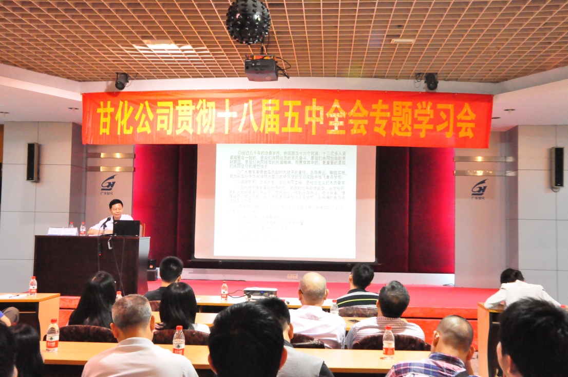 2016年5月17日下午,在甘化大廈17樓會(huì)議廳,公司黨委舉辦貫徹黨的十八屆五中全會(huì)精神專題學(xué)習(xí)會(huì),會(huì)議由黨委書(shū)記、工會(huì)主席方小潮領(lǐng)學(xué)主講,重點(diǎn)學(xué)習(xí)貫徹黨的十八屆五中全會(huì)精神、十三五規(guī)劃綱要和全國(guó)兩會(huì)精神。公司本部、德力光電、生物中心黨、工、青、婦等員工70多人參加了會(huì)議。