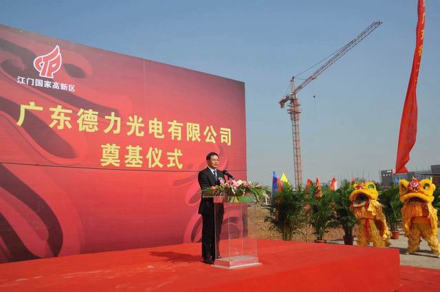 奠基儀式由高新區(qū)管委會副主任費偉東先生主持,甘化股份董事長兼總裁麥慶華先生和江門市政協(xié)副主席譚繼祖先生分別在會上致辭。最后,在轟鳴的禮炮聲中,各位領(lǐng)導(dǎo)為廣東德力光電有限公司外延片、芯片生產(chǎn)項目埋下了奠基石,奠基儀式在一片祝福聲中圓滿結(jié)束。