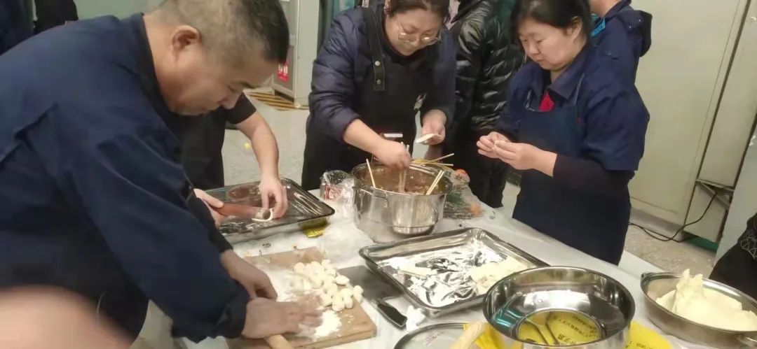 和面、拌餡、包餃子、煮餃子把活動(dòng)推向了高潮,大家擼胳膊挽袖子,各顯神通,一個(gè)個(gè)象征著團(tuán)圓的餃子鋪滿了桌面,在幸福歡快的背景樂下,整個(gè)場(chǎng)面再次熱氣騰騰。